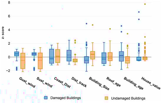 Comparative box plot of standardized factors affecting building damage.
