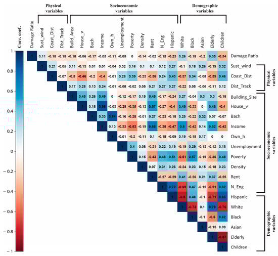 The correlation among all variables in the census tracts is illustrated in Figure 5, where the divergent color scheme from red to blue indicates the direction (blue: positive; red: negative), and the color intensity represents the strength correlation (i.e., correlation coefficient). As expected, building damage is positively correlated with sustained wind speed and negatively correlated with the coast and hurricane track distances. These correlations confirm that hurricane intensity is an influential factor in building damage. However, the strongest correlations with the damage ratios are found among the socio-economic variables. For example, the damage ratio shows strong positive correlations with the percentage of elderly people and the white population, implying that the elderly and white communities have experienced more damage. In contrast, the damage ratio is negatively correlated with the percentage of children, the Hispanic/Latino population, black population, and non-English speakers, suggesting that communities with a higher ratio of children, Hispanic/Latino populations, black populations, and immigrant populations may have endured less damage.