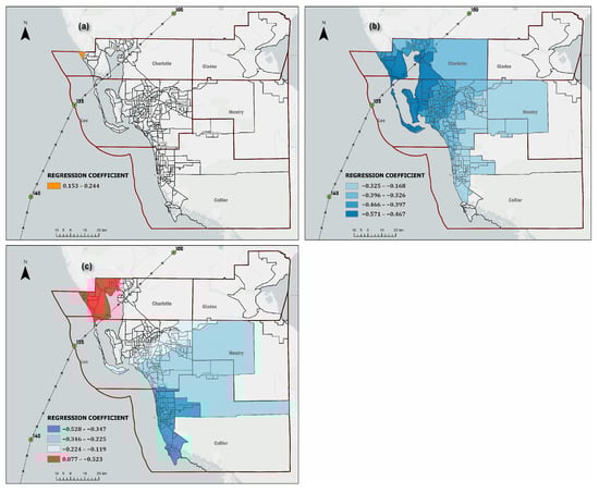 Coefficient surfaces of the three hurricane intensity variables: (a) sustained wind speed, (b) distance to the coast, and (c) distance to hurricane track in the GWR models. The colored polygons are census tracts that show a significant relationship (p < 0.05) in the neighborhoods. The color intensity represents the regression coefficient.