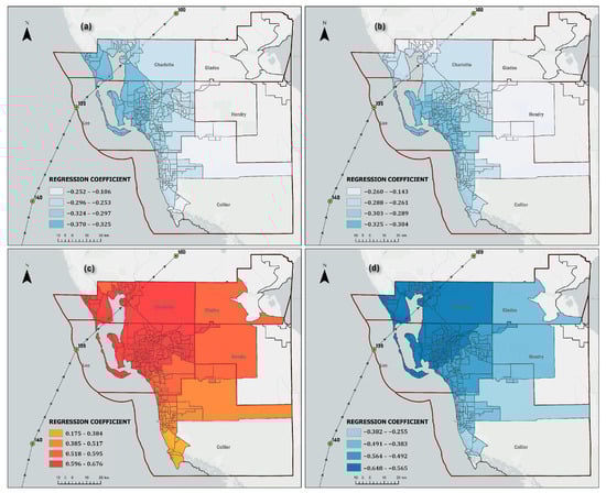 Coefficient surfaces of four independent socio-economic variables: (a) Building_Size; (b) Asian population; (c) elderly population; and (d) children. The colored polygons are census tracts that show a significant relationship (p < 0.05) in the neighborhoods. The color intensity represents the regression coefficient.