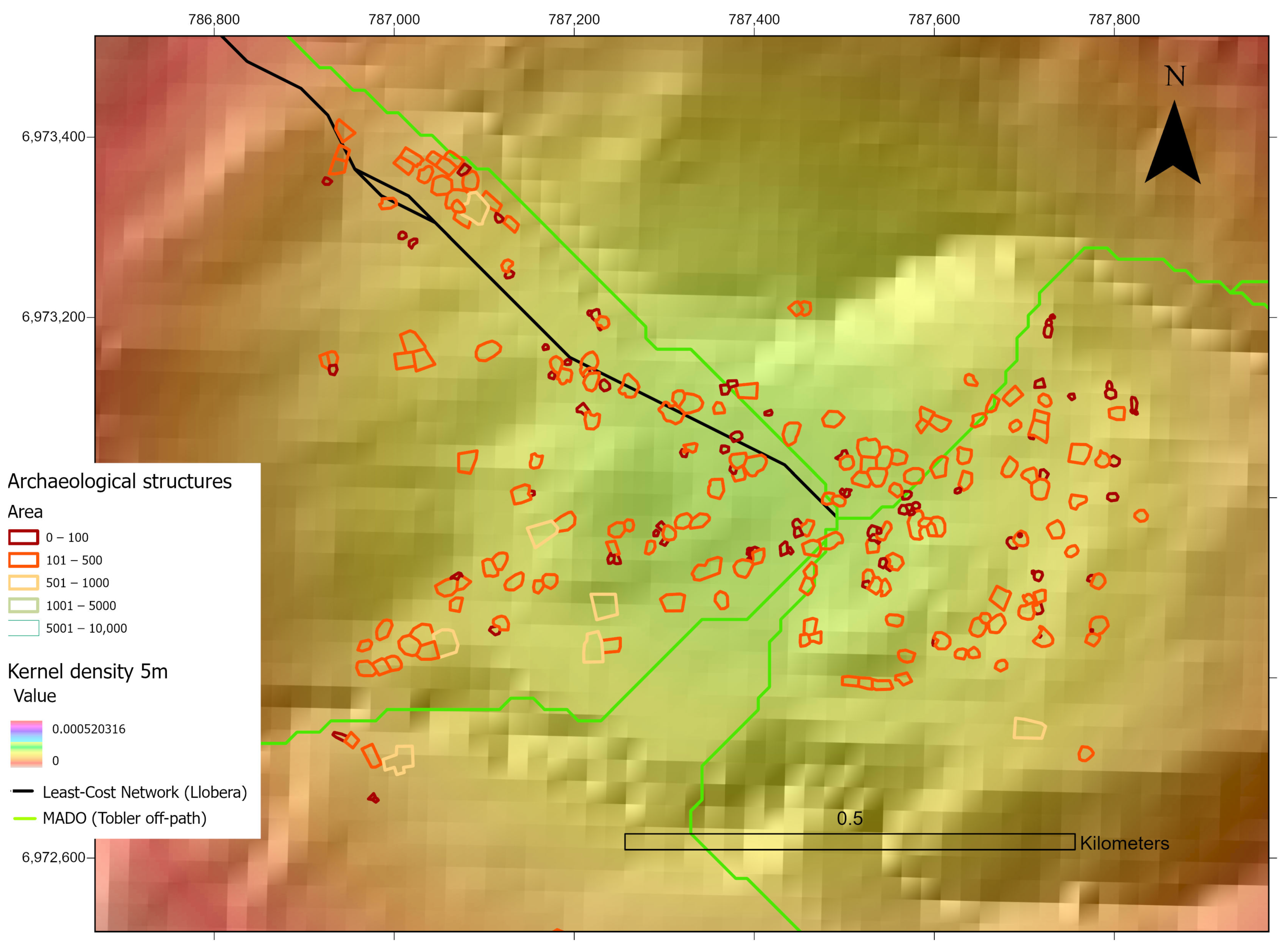- E-W axis connectivity optimal routes have been flagged up consistently by MADO analysis for main aggregated sites (Figure 10). Given that Least-Cost calculations will identify routes or corridors in any scenario where both the start and the end point of the journeys are specified, MADO is a better method to explore routes’ potential, considering any optimal scenario around a central point. Accordingly, a range of optimal routes linking uplands with lower altitudes has been highlighted by this method, including in the Tesoro ravine, where a main optimal route could connect the early Formative Period site Antigal de Tesoro with both the main cores of aggregation within the larger settlement Tesoro I, and with peripheral aggregations borderline to the upper limit of the optimal zone (Figure 8). Further on, this site could also connect naturally with other main site agglomerations on the western flank of the Sierra, with roads skirting the upper sections of the alluvial fans (see above) and descending through the middle section of the terrace where Tesoro 1 is located, which offers flatter and higher ground relative to the riverbed (Figure 10b). Some MADO lines also connect Antigal de Tesoro with the higher edges of the alluvial fan above the ‘optimal strip’ where the larger site is located, suggesting potential complementary productive uses that must be further investigated. MADO analysis in this ravine also shows several opportunities for optimal movement eastwards across the mountains, including—but not limited to—the well-known crossing point of Abra del Toro [17,61] (4400 m asl, the lowest crossing point in the Sierra) and the path that leads to La Ciudacita (Figure 10b). The latter was further visualised via LCP and corridor analysis to provide a sensible image of an alternative movement strategy. The mobility lines and statistical accumulation as corridors coincide with well-known roads and crossing points of the Sierra still in use [17], giving further confidence in the outcomes of this analysis.