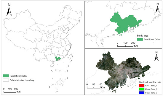 The basic data shown in Figure 1 include the 2020 Gaofen-1 satellite remote sensing image of the Pearl River Delta region, which has a resolution of 16 m. The GXL v1 software was used to preprocess images of the Pearl River Delta region, including mosaic and orthorectification. The projection coordinate system is WGS-1984-UTM-Zone-49N.