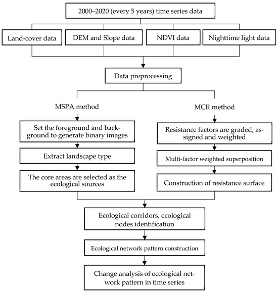 This research focused on the temporal and spatial changes of the ecological network spatial pattern in the Pearl River Delta national forest urban agglomeration. The technical processing flowchart is shown in Figure 2.