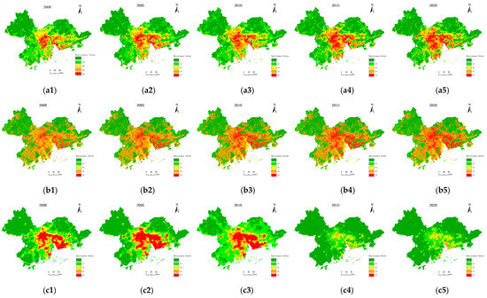 As can be seen in Figure 3a1–a5, the resistance value of the NDVI factor increased over time, indicating that the vegetation coverage area in the research area is decreasing. As can be seen in Figure 3b1–b5, the area of impervious surfaces in land-cover types increased, resulting in an increase in the red area with high resistance values. In Figure 3c1–c5, due to the obvious oversaturation of the DMSP/OLS data used from 2000 to 2010, the red resistance value range is large, while the details are not as clear as in the VIIRS data of 2015 and 2020.