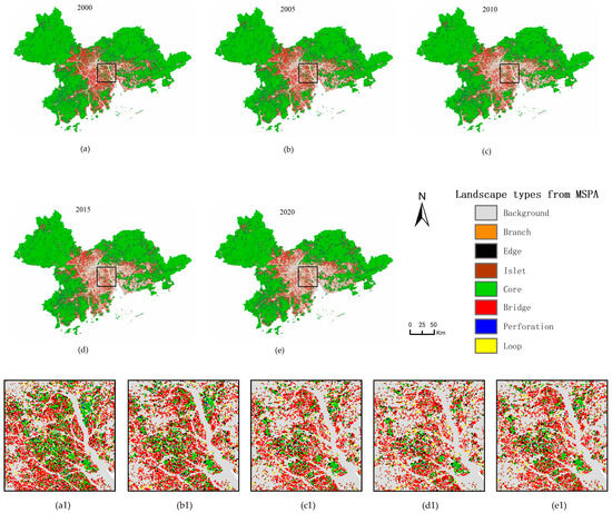 Landscape types based on the MSPA method. (a–e) represent the MSPA type of the global image of the Pearl River Delta from 2000 to 2020, and (a1–e1) represent the MSPA type (highlighted in the black block) of the local image of the Pearl River Delta from 2000 to 2020.