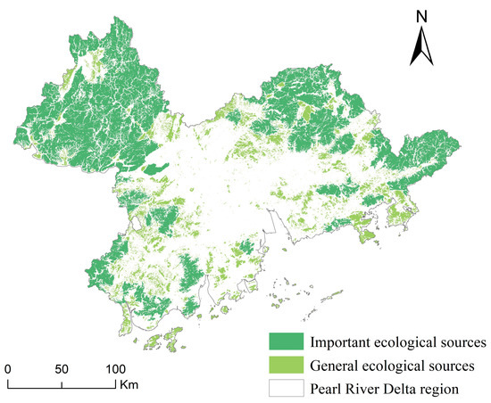 Ecological source areas are large ecological patches with high connectivity and ecological service value. From 2000 to 2020, there was almost no change in the spatial distribution of ecological sources. From the perspective of space, the ecological source areas are mainly distributed in the northwest, southwest, and northeast of the Pearl River Delta, and the large ecological source areas are concentrated in the northwest. This research combined , , and to measure the patch connectivity and importance, and comprehensively considered the patch area and its spatial distribution to extract important ecological sources and general ecological sources (Figure 5). The core is the most important landscape type in MSPA, which is used to extract ecological sources and ecological corridors. This research adopted the minimum area threshold method [15] to select ecological source areas, excluding small and scattered patches with limited impact, and finally selected 15 core area patches with an area greater than 100 hm2 as important ecological sources.