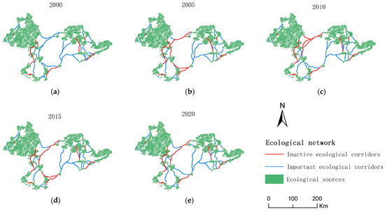 Ecological corridors refer to the narrow and continuous strip areas between ecological sources, which can improve the migration efficiency of organisms and promote gene exchange between local populations, thereby reducing the negative impact of habitat patch fragmentation [53]. They not only enable sustainable landscape ecological processes, but also help to enrich the biodiversity of the local area. The ecological corridor connects two ecological sources, making it the minimum resistance channel between the two sources. In the MCR model, the ecological corridor is established on the path with the lowest cost connecting the ecological sources [54]. The shortest path was calculated to form ecological corridors between the source and source areas based on the important ecological source points and ecological resistance surfaces. The ecological corridors of the Pearl River Delta region from 2000 to 2020 were extracted from the least cost path (LCP) using the ArcGIS Linkage Mapper 2.0 software, consisting of active and inactive ecological corridors. The number and length of the ecological corridors vary from year to year. As shown in Figure 7, active and inactive ecological corridors together form the ecological network.