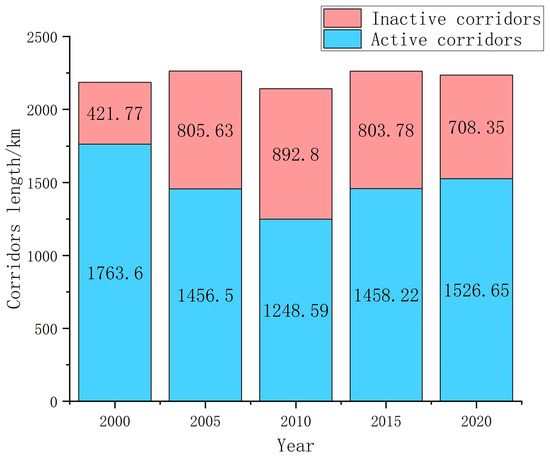 As shown in Table 4, the number of ecological corridors between large core areas decreased from 57 in 2000 to 53 in 2010, and increased to 55 in 2020. The total length of the ecological corridors did not change significantly between 2000 and 2020, but the lengths of the active and inactive ecological corridors showed significant changes (Figure 8). The changes in the active ecological corridors showed a trend of first decreasing and then increasing. The length of the active ecological corridors was the longest in 2000. From 2000 to 2010, the length of the active ecological corridors decreased from 1763.60 km to 1248.59 km, a decrease of 29.20%. The length of the active ecological corridors gradually increased to 1526.65 km from 2010 to 2020. The length variation trend of the inactive ecological corridors was opposite to that of the active ecological corridors. The length of the inactive ecological corridors increased from 421.77 km in 2000 to a peak of 892.80 km in 2010. From 2010 to 2020, there was a slight decrease in the length of the inactive ecological corridors, indicating an improvement in the material and energy exchange capabilities between the large core areas of the Pearl River Delta.