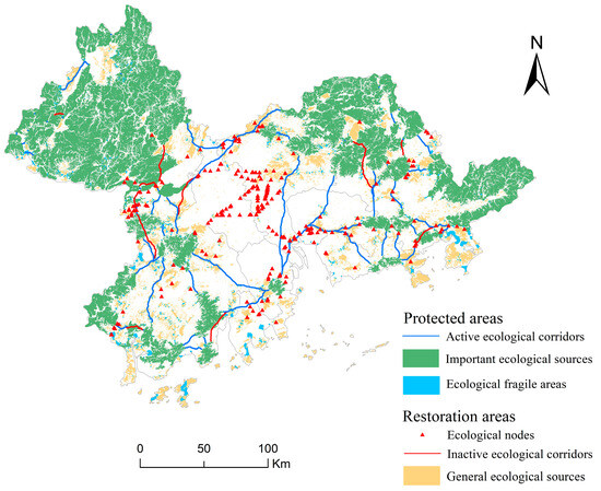 Priority protected areas are mainly the backbone of the ecological network composed of ecological source areas with high importance, ecological corridors with high activity, and ecologically fragile areas, which need priority protection. Priority restoration areas are mainly distributed in the centers of urban agglomerations and coastal shelterbelts (Figure 9). Ecological break points and inactive ecological corridors play a key role in the ecological connectivity between the east and west of the Pearl River Delta and the coastal areas, and need to be repaired. Through the construction of national forest urban agglomerations, the ecological sources in the Pearl River Delta have increased significantly, and the ecological corridor paths have changed, forming a new ecological fracture point aggregation. To protect and repair the ecological break points, we can take effective measures such as increasing the greening of roads, building ecological bridges, improving the connectivity of ecological corridors, and reducing the ecological flow of channels.