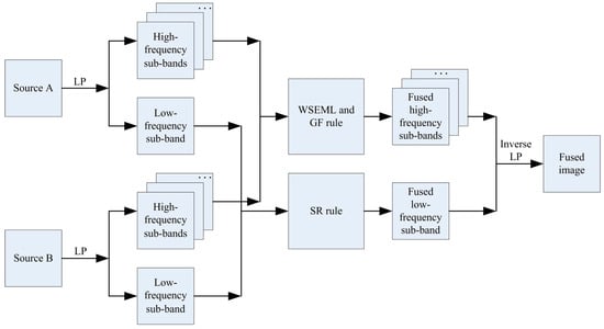 In this section, we present a technique for fusing infrared and visible images using sparse representation and guided filtering within the Laplacian pyramid framework. The method involves four main stages: image decomposition, low-frequency fusion, high-frequency fusion, and image reconstruction. The structure of the proposed method is shown in Figure 2.