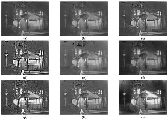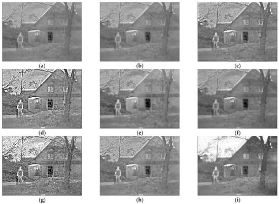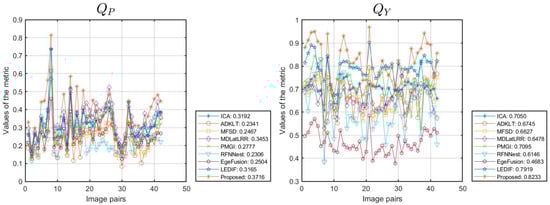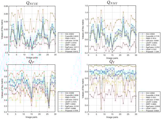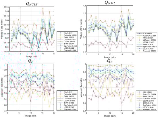 In this section, we conducted simulation experiments using the TNO public dataset [49] and compared them through qualitative and quantitative evaluations. Figure 3 shows the examples from the TNO dataset. We compared our algorithm with eight other image fusion algorithms, namely, ICA [50], ADKLT [51], MFSD [52], MDLatLRR [53], PMGI [54], RFNNest [55], EgeFusion [56], and LEDIF [57]. For quantitative evaluation, we adopted 10 commonly used evaluation metrics to assess the effectiveness of the algorithm, namely, the edge-based similarity measurement [58,59,60,61,62,63], the human-perception-inspired metric [64,65], the structural-similarity-based metric [64], the feature mutual information metric [66], the gradient-based metric [64], the mutual information metric [58,67], the nonlinear correlation information entropy [64], the normalized mutual information [64], the phase-congruency-based metric [64], and the structural-similarity-based metric introduced by Yang et al. [64,68,69]. computes and measures the amount of edge information transferred from the source images to the fused images using a Sobel edge detector. is a perceptual-fusion metric based on human visual system (HVS) models. takes the original images and the edge images into consideration at the same time. calculates the regional mutual information between corresponding windows in the fused image and the two source images. is obtained from the weighted average of the edge information preservation values. computes how much information from the source images is transferred to the fused image. is an information-theory-based metric. is a quantitative measure of the mutual dependence of two variables. provides an absolute measure of image features. is a fusion metric based on SSIM. A higher index value indicates the algorithm’s superiority.