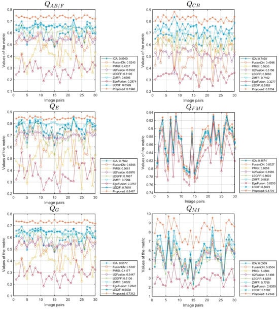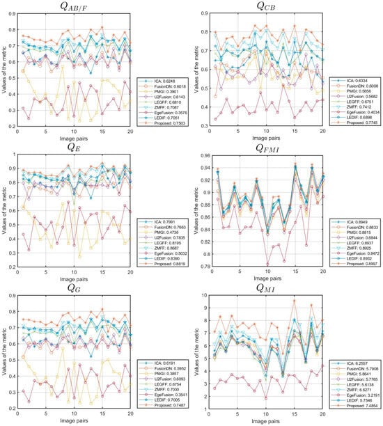 Figure 9 provides detailed insights into the objective performance of the various fusion methods across 42 pairs of data from the TNO dataset. The horizontal axis represents the number of data pairs used in our experiments, while the vertical axis represents the metric values. Each method’s scores across different source images are plotted as curves, with the average score indicated in the legend. Figure 9 illustrates that most methods show consistent trends across the metrics examined, and nearly all fusion methods demonstrate stable performance across all test images, with few exceptions. Therefore, comparisons based on average values in Table 6 hold significant value.