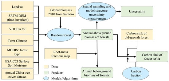 - Chen, Y.; Feng, X.; Fu, B.; Ma, H.; Zohner, C.M.; Crowther, T.W.; Huang, Y.; Wu, X.; Wei, F. Maps with 1 km resolution reveal increases in above- and belowground forest biomass carbon pools in China over the past 20 years. Earth Syst. Sci. Data 2023, 15, 897–910. [Google Scholar] [CrossRef]
