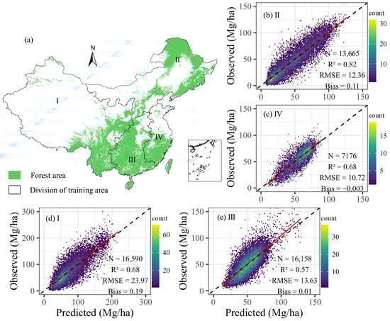 Validation of RF models for different areas. The study area was divided into four regions (a) to assess the model’s accuracy across different regions (b–e). Heat plots show the relationships between the AGB of the predicted and sampling points in forests. The red lines represent the best-fit linear models, and the dashed lines represent 1:1 relationships. N represents the number of points in this area used for validation.