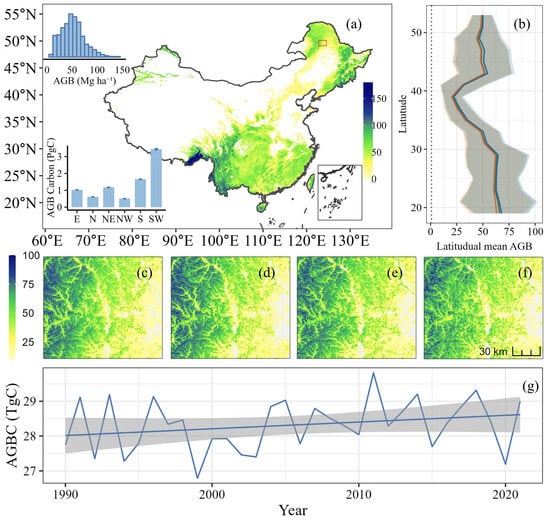 Spatial patterns of forest AGB. (a) Spatial patterns of averaged forest AGB from 1990 to 2021. (b) Latitudinal gradient summary of averaged forest AGB from 1990 to 2021. The three orange green and blue lines represent the lower, mean, and upper predictions. (c–f) Averaged AGB of the areas indicated in the red boxes during the 1990s, 2000s, 2010s, and 2020s. (g) The total annual AGB carbon for the region is indicated in the red box. The blue solid line represents the temporal trend of AGBC over time, while the gray shading indicates the confidence interval of the linear regression trend line.