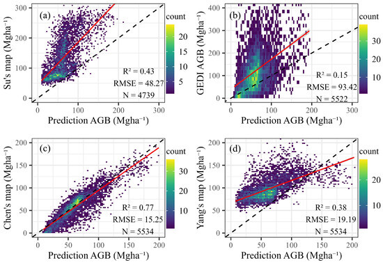 Predicted AGB in this study versus the estimates from other products. (a–d) Predicted AGB in this study versus the estimates from Su’s map, GEDI AGB, Chen’s map and Yang’s map. The red lines represent the best-fit linear models, and the dashed lines represent 1:1 relationships.