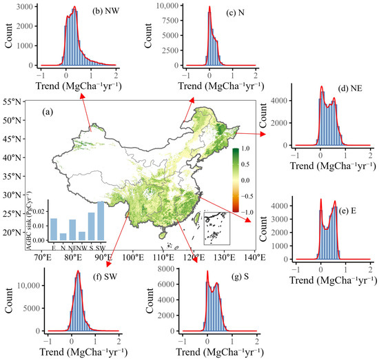 Spatial patterns of the forest AGB carbon sink. (a) Spatial patterns of the forest AGB carbon sink and the AGB carbon sink by regions. (b–g) Frequency distribution of the AGB carbon sink in different regions of China.