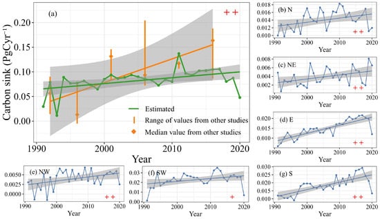 Temporal dynamics of the forest AGB carbon sink. The green lines in the main figure show the AGB carbon sink time dynamics estimated in this paper. The orange lines and points are the estimate of the forest AGB carbon sink from other studies, where the horizontal coordinate corresponding to the point is the median value of the study period, and the vertical coordinate corresponding to the point is the median value of the estimate from other studies. (a–g) Changes of carbon sink in different regions over time. The + in the figure represent upward trends, where ++ indicates a significant rise (p < 0.05). The blue solid line represents the temporal trend of carbon sink over time, while the gray shading indicates the confidence interval of the linear regression trend line.
