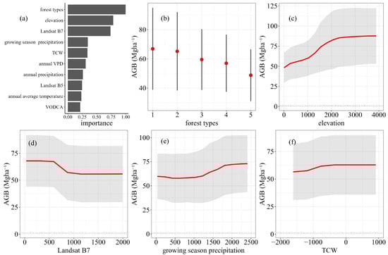 Environmental drivers of forest AGB. (a) Relative importance measure of the effect of predictors on forest AGB from RF models. Figure (b–f) show partial influences of (b) forest types, (c) elevation, (d) Landsat B7, (e) growing season precipitation, and (f) TCW on AGB values of all forests. Only the most important variables are shown.