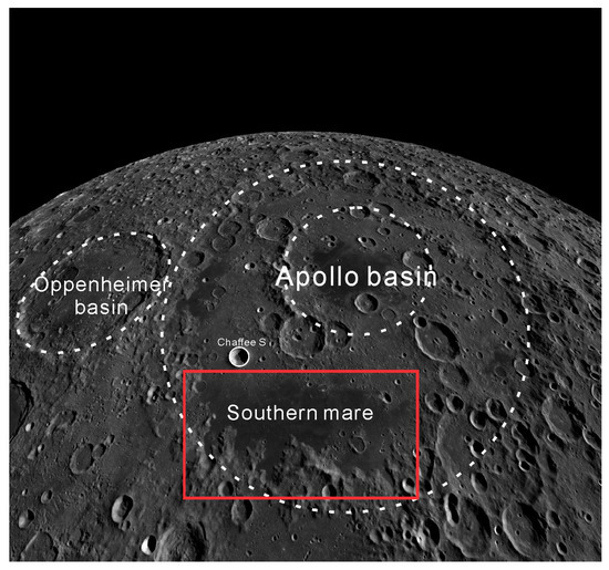 Oblique view of the Apollo basin taken from QuickMap (https://quickmap.lroc.asu.edu/, accessed on 4 May 2024) based on the 100 m/pixel Lunar Reconnaissance Orbiter Camera (LROC) Wide Angle Camera (WAC) mosaic. The white dashed lines represent the basin rims. The southern mare of the Apollo basin is marked with a red rectangle. The crater marked with a white solid circle is the Chaffee S crater.