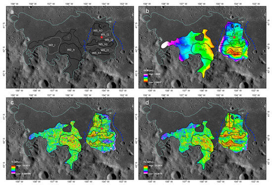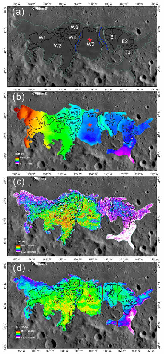 The subunits within the W2 and W5 region. (a) WAC image (100 m/pixel, [19]). (b) SLDEM2015 (~59 m/pixel, [22]). (c) TiO2 abundance map derived from the WAC reflectance mosaics (~400 m/pixel, [23,26]). (d) Kaguya MI FeO map (~60 m/pixel, [24]). (b–d) are maps overlaid on the LROC WAC images. The black solid lines are the boundaries of the mare basalt with higher Ti and Fe contents, while the gray solid lines represent the lower Ti/Fe mare basalt. The blue lines with diamonds are wrinkle ridges. The red star represents the Chang’e-6 landing site.