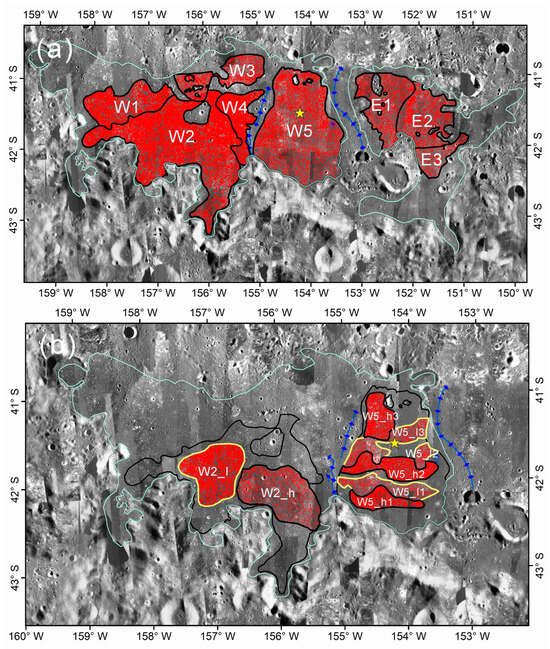 Boundaries of the units and counted craters outlined in red. (a) The counted craters of the units within the W and E region. (b) The counted craters of the subunits within the W2 and W5 region. The blue lines with diamonds represent the wrinkle ridges. The yellow star represents the landing site of Chang’e-6.