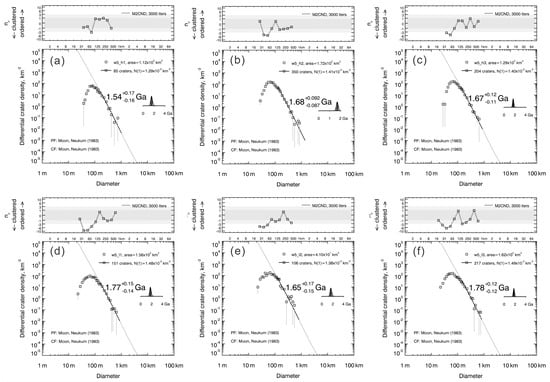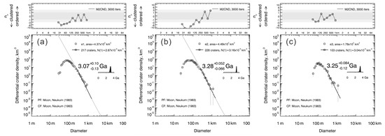 Using the integrated LROC NAC images as the basemap, mapping the craters was done on the ArcGIS platform. The CraterTools was employed to manually map the craters since it is easy to locate the crater and measure the diameter [31]. A crater can be localized with three points on the crater rim. The property list generated by ArcGIS records the information about the longitude, the latitude, and the diameter of the crater. With this information, fitting the absolute model ages (AMAs) via Poisson timing analysis and randomness analysis with 3000 iterations is carried out with the program Craterstats [32,33,34]. CraterTools and Craterstats are available at http://hrscview.fu-berlin.de/software.html, accessed on 4 May 2024. Production function and chronology function by Neukum [29] were employed. The regions containing secondary craters (crater chains and crater clusters), residual basin floor, and wrinkle ridges/orthomorphies as well as the regions possibly affected by the basin rims are excluded. We used the differential plots of crater density to find an absolute model age. With the differential data presentation, we can better understand the partial resurfacing events.