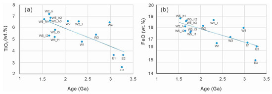 The relationships between age and TiO2 and FeO abundances. (a) TiO2 vs. Age. (b) FeO vs. Age.