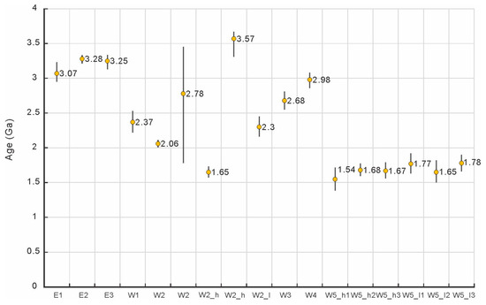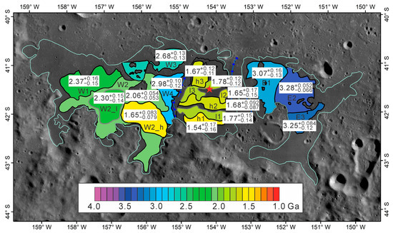 As for the E region, the units are of the Imbrian period, with a similar age of ~3.2 Ga (E1 of Ga, E2 of Ga, and E3 of Ga) (Figure 6). The W region has a complex age assemblage with an age range of ~0.9 Ga, an oldest model age of Ga, and a youngest age of Ga. W1, W3, and W4 have ages of Ga, Ga, Ga (Figure 7a,e,f). W2 has two absolute model ages. One is Ga and the other is Ga (Figure 7b). When the lava flow is too thin to cover the older craters, a second older age of the underlying layer can be obtained in the crater counts [16]. That means the older age indicates another epoch/lava flow. The W2 region was divided into W2_ h and W2_ l since W2_ h has higher Fe and Ti abundances (Figure 4c,d). W2_ h has a relatively younger age of Ga and an older age of Ga, which may indicate two mare basalt epochs (Figure 7c). We used the younger age as the age of the W2_h unit. The older age may indicate the underlying basaltic terrain. W2_l is Ga. Since the W5 region has an albedo anomaly and Ti/Fe abundance differences, it was divided into three relatively higher Ti/Fe mare basalt units (W5_h1, W5_h2, and W5_h3) and three lower Ti/Fe basalt units (W5_l1, W5_l2, and W5_l3) (Figure 4). For the relatively higher Ti/Fe subunits, we obtained an age of ~1.68 Ga. The three W5_h subunits are quite consistent with one another. For three W5_l subunits, W5_l1 has an age of Ga, W5_l2 of Ga, and W5_l3 of Ga (Figure 8). They are all of the Eratosthenian period.
