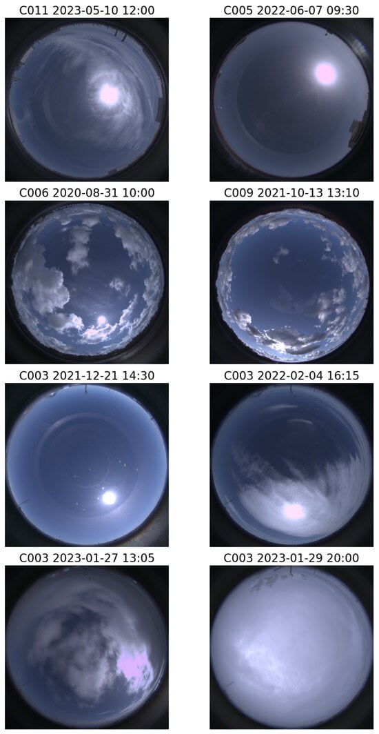 We obtained the dataset retrieved from the pyranometers described in Section 2, containing measurements of GHI every minute. Additionally, we have daytime images captured by the aforementioned all-sky cameras every 5 min. The picture datasets contain all-sky HDR images taken using the different cameras operating at the different stations. These images were captured every 5 min, combining a sequence of various raw images captured consecutively at different exposure times, usually doubling the time exposure; this helped obtain the final HDR image. All the available raw images of a sequence were normalized to the same lowest exposure time and averaged (discarding saturated pixels). The averaged image was tone mapped by using a root square function, and they were white balance-corrected using the same fixed values for all images. After that, the signal of each pixel was normalized by dividing each pixel signal by the 99.5 percentile of all the pixel signals. This image was multiplied by 255 and rounded to be converted to 8-bit when it was finally demosaiced. This process is explained in detail in []. The final HDR images are 2000 × 2000 pixels at an 8-bit resolution. In Figure 1, some examples of these sky HDR images are shown for different sky conditions and for all cameras and stations. These datasets have been filtered and classified, as explained in the next sections.