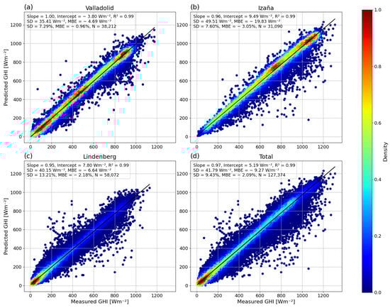 Density scatter plots between the shortwave global horizontal irradiance (GHI) predicted by the trained CNN-CMF model and the measured one with a pyranometer. Panels (a–d) correspond to the test dataset of Valladolid, Izaña, Lindenberg, and all stations together, respectively. The color bar marks the density of the points ranging from 0.0 to 1.0. The black straight line represents the linear fit. The linear fit coefficients, the number of data used (N), the standard deviation (SD), and the mean bias error (MBE) values of the GHI differences between the CNN-CMF model and the measured values are also added (in relative and absolute values) for each panel.