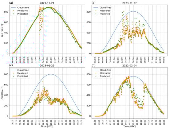 Daily evolution of the shortwave global horizontal irradiance (GHI) measured (1 min) and predicted by the CNN-CMF model (5 min) at the Marambio station for four different dates: 21 December 2021 (a), 27 January 2023 (b), 29 January 2023 (c), and 4 February 2022 (d). The green points correspond to the predicted GHI values, the orange points to the GHI measurements, and the blue line to the cloud-free GHI simulations.