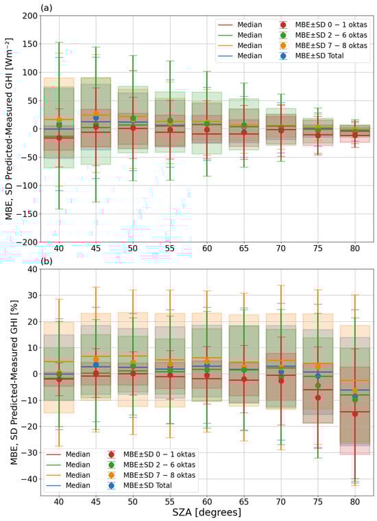 Mean bias error (MBE) of the shortwave global horizontal irradiance (GHI) differences between the predicted CNN-CMF model and the measured values for different solar zenith angle (SZA) bins. The MBE was calculated by splitting the data as a function of the cloud cover into three groups, 0–1 oktas (red), 2–6 oktas (green), 7–8 oktas (orange), showing the results for cloud-free, partly cloudy, and totally covered conditions, respectively. The total results have also been plotted (blue). The error bars represent the ±SD of the differences for each interval. The median values are also represented by straight lines of the same color for each case. The boxes correspond to the 25th and 75th percentiles, depicted in the same colors for each class, respectively. Panel (a) shows the MBE and SD in absolute values and (b) in relative values.