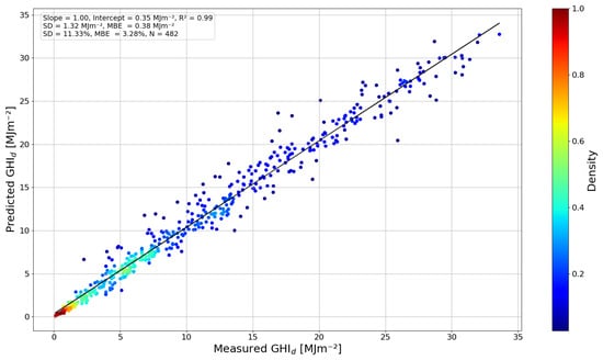 The predicted GHId values have been represented as a function of the measured reference values in Figure 6, which shows a density scatter plot for the 482 available days. As a result, the GHId from the CNN-CMF model correlates with the measurements with a high determination coefficient of . In addition, the linear fitting is close to the line 1:1, with the slope and the y-intercept equal to and 0.35 MJm−2, respectively. The MBE value shows an accuracy of about 3% (0.38 MJm−2), with a precision given by a SD value of about 11% (1.32 MJm−2). These results indicate that, on average, the CNN-CMF model slightly overestimates GHId (by 3%) more than GHI (by 2%). This can be explained by the fact that CNN-CMF tends to overestimate GHI more for low SZA values (see Figure 5). Since the GHI values for the lower SZA values are typically higher than for larger ones, they contribute more to the final GHId, resulting in an overestimation. The precision of the CNN-CMF model is better for these values, as the SD reduces from 26% for GHI to 11% for GHId.