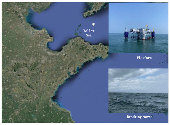 The measurement was carried out on the offshore platform that belongs to the National Satellite Ocean Application Center of China in July 2021. The platform is located about 50 nautical miles north of Yangma Island in the Yellow Sea and equipped with the capability for continuous 24-h monitoring of wind speed and direction. The antenna direction is oriented 100° clockwise from the north for observation of sea surface driven by the SE wind. The platform is far away from the mainland; therefore, the radar echo is less disturbed by land clutter. Additionally, during the measurement period, no ships passed by due to the fishing moratorium, and all irrelevant electronic equipment on the platform was turned off in order to minimize the interference of electronic devices on the measurement. During the measurement, foam and wave breaking could be observed, as shown in Figure 1.