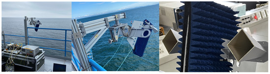 The antenna is mounted on a support structure, positioned at a height of 8.6 m above sea level. The antenna utilizes a horn transmitter to illuminate the ocean surface. We used electromagnetic absorbing foam in select locations to maximize the isolation between the radar antennas, and thereby reduce short-range leakage between the transmitter and receiver, as shown in Figure 3.