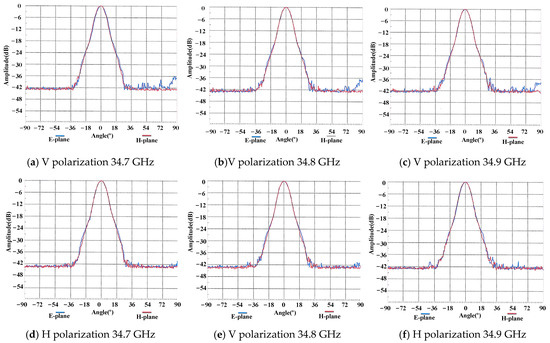 Polarization isolation can be obtained by the following steps: Align the transmitting and receiving antennas to face each other. When the transmitting and receiving antennas are co-polarized, record the received signal level. Then, switch the transmitting antenna to cross-polarization and record the received signal level again. The difference between the two received signal levels is the polarization solation of the receiving antenna. The polarization isolation antenna patterns of the Ka-band antenna are shown in Figure 6.