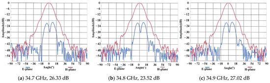 The antenna pattern measurement system, as depicted in Figure 4, comprises the spectrum analyzer, signal source, turntable, test antenna and transmitting antenna. The signal generator is set to a single-frequency mode. A standard gain horn is used for transmission. We can obtain the antenna patterns as well as the antenna gain and 3 dB beamwidth for both the E-plane and the H-plane of the antennae from the spectrum analyzer. The antenna patterns of the Ka-band antenna in V-polarization and H-polarization are shown in Figure 5.