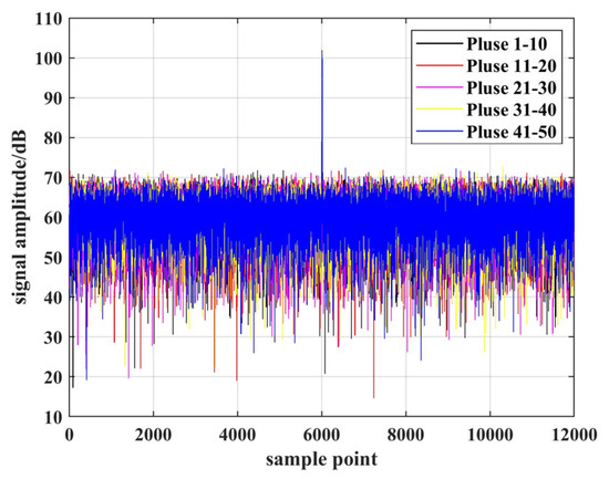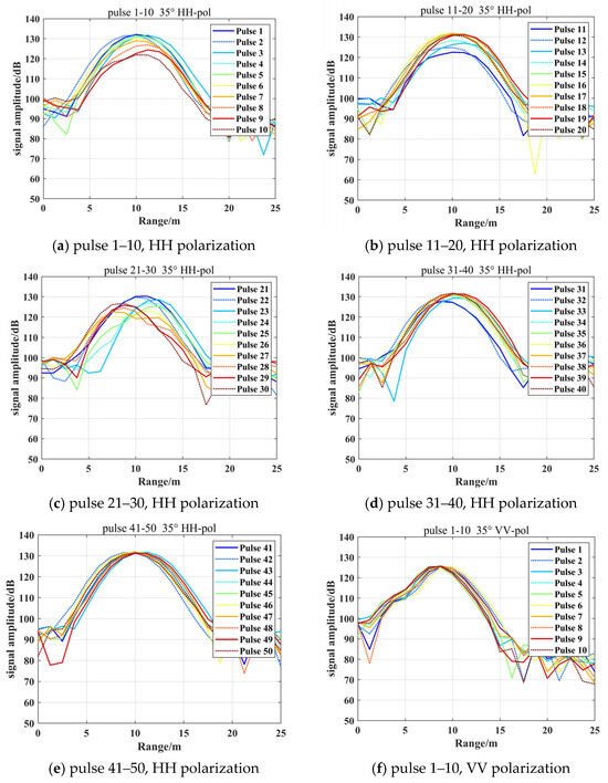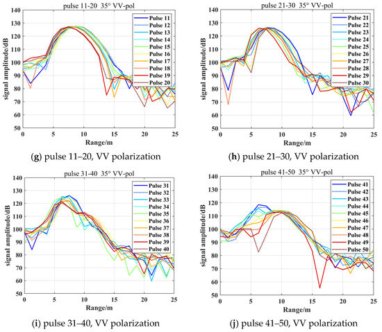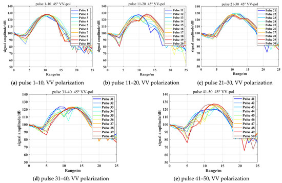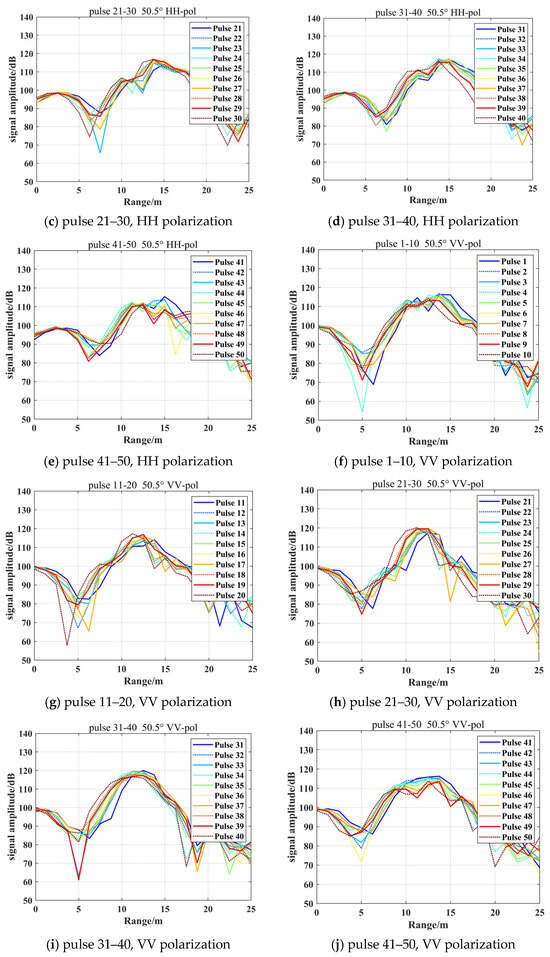 Figure 14 shows the sea echo amplitudes of different pulses with 45° incidence in an observation sample under VV polarization. As can be seen from the figure, for pulses 1–10, the sea surface echo exhibits a single-peak signal, then gradually transitions to a bimodal pattern for pulses 11–20. For pulses 21–30, the sea surface echo signal transitions from a one peak signal to a bimodal pattern with a slight shift in the corresponding slant range. For pulses 31–40, it gradually changes from a double-back to a single peak, with the energy of the double peak being approximately 18 dB lower than that of the single peak. For pulses 41–50, the sea surface echo initially presents as a single peak, later developing into a single peak with a smaller side-lobe peak, then changes back to a single peak. These changes indicate that, within an observation period of 10 ms, the ocean waves undergo rapid variations. In other words, these signal changes correspond to the wave motion, breaking, and other variations of the waves.
