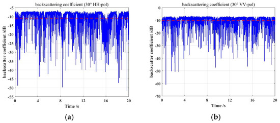 Backscatter coefficient of sea surface with 30° incidence: (a) 30° incidence, HH polarization and (b) 30° incidence, VV polarization.