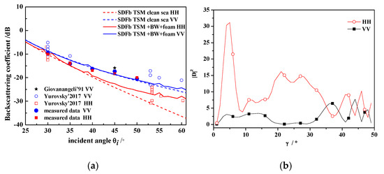 It is known that for large-area statistical sea-surface observation, Bragg scattering from the sea surface dominates at medium incidence angles (30°–60°). Generally, the backscattering coefficient of the sea surface in VV polarization is greater than HH polarization under the same wind speed. As the wind speed increases, the sea surface becomes rougher, which enhances the interaction between radar waves and the sea surface, leading to an increase in the backscatter coefficient. The backscatter coefficient in HH polarization surpasses that in VV polarization, which usually occurs at small grazing angles with high wind speed. However, during this measurement, an intriguing phenomenon emerged: at the medium incidence angle, the backscatter coefficient in HH polarization was close to (or even surpasses) by that in VV polarization within a wind speed range of 7.1 to 8.6 m/s. We compared the observational data with the slope-deterministic, facet-based two-scale model (SDFb-TSM), the modified SDFb-TSM with breaking waves and foam developed in our previous work [22,23], and published data [24], as shown in Figure 11a.