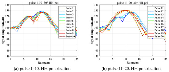 In this section, we analyzed the short-duration observation (10 ms) for the sea-surface scattering characteristics. As shown in Figure 12, for a 35° incidence angle with HH polarization and a sea-surface wind speed of 7.5 m/s, the sea surface echo exhibits a stable single-peak signal throughout the short-term observation, indicating slow ocean wave changes. In contrast, with VV polarization and a higher sea-surface wind speed of 8.3 m/s, the wave motion on the sea surface changes more dramatically. Especially for pulses 41–50, sea waves may break, resulting in a double-peak in the sea surface echo, with the peak corresponding to a range offset from the radar beam center. The amplitude of the sea surface echo decreases significantly, with the maximum value dropping by approximately 15 dB.