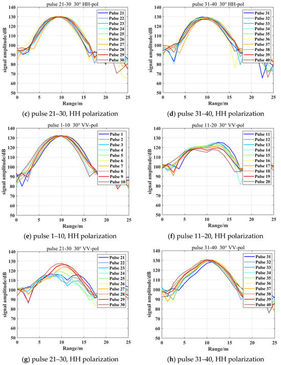 Sea echo of different pulses in a single observation sample with 30° incidence: (a–d) HH polarization, windspeed = 8.6 m/s and (e–h) VV polarization, windspeed = 8.1 m/s.