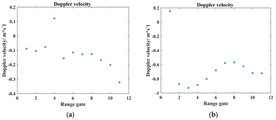 From Figure 16, it can be seen that at a 45° incidence angle and similar wind speeds, the sea surface echo under HH polarization exhibits a more stable single peak compared to that under VV polarization. Further analysis of the Doppler velocity in Figure 17 reveals that the Doppler velocity can reflect rapid changes in ocean wave motion. Within an observation period of 10 ms, where the sea surface echoes exhibit a solitary peak, the Doppler velocity fluctuations across various range gates manifest as relatively mild. Conversely, when the beam’s center detects rapid oceanic changes, abrupt changes, or outliers in the Doppler velocity, fluctuations will occur near the corresponding range gate.