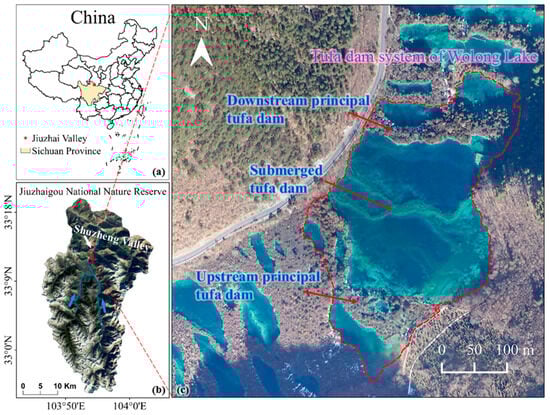 (a) The study site is located in Sichuan Province, China; (b) Jiuzhaigou National Nature Reserve; (c) the tufa dam system of Wolong Lake.