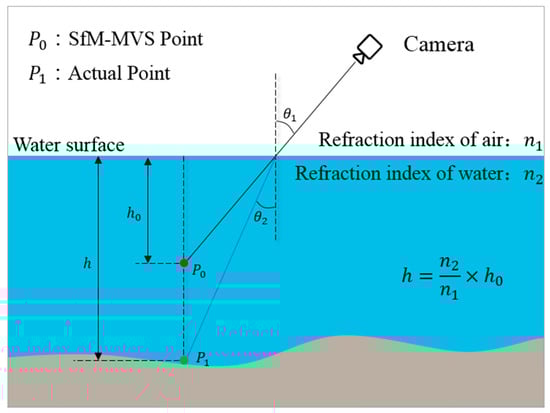 For the underwater part of the initial DSM, there is a certain deviation of the position due to the refraction of light occurring at the interface of the air and water. During auto-triangulation processing, the SfM-MVS algorithm just seeks tie points between adjacent images, being unaware of this deviation. Hence, the resulting underwater DSM is inaccurate. As shown in Figure 3, the reflection of light at point P1 refracts at the water surface and is recorded by the UAV-loaded camera. Following the principle of straight-line propagation of light, the auto-triangulation software attempts to trace back the position of P1 along the incident direction. Therefore, it wrongly identifies the position of P0 as that of P1. In order to obtain accurate underwater terrain, refraction correction must be applied to the initial DSM of the water-covered region. He et al. has demonstrated that refraction correction could yield reliable underwater terrain of a tufa lake, especially within a water depth range of 12 m [16]. As Wolong Lake and Spark Lake (the study object in [16]) have a similar water depth range, the simple refraction correction model (Equation (1)) can be soundly used to correct the underwater terrain of the study site. In the model, the refractive index of the air is generally defined as 1.0, and the refractive index 1.34 of natural water is usually used as that of tufa lake water due to their slight density difference.