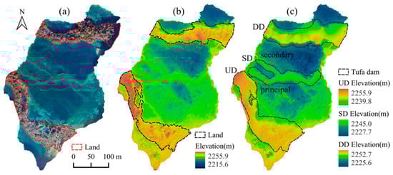 Based on Figure 7e, the spatial scopes of the three tufa dams of Wolong Lake were delineated out according to the natural slope extension of the dam bodies (Figure 6c). It was worth noting that the spatial scopes of upstream and downstream dams were somewhat larger than those of the above-water parts delineated in Figure 6b. It was because the upstream and downstream tufa dams were composed of the above-water part and underwater part. As indicated in Figure 6c, the submerged tufa dam was bifurcated into two sub ones (principal and secondary dam) on the left.