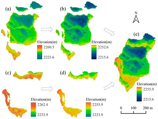 The complete DEM of the study site by stitching the resulting DEMs after refraction correction and ground interpolation. (a) The initial underwater DSM; (b) the resulting DEM via refraction correction; (c) the initial above-water DSM; (d) the resulting DEM removed of vegetation; (e) the complete DEM of the study site.