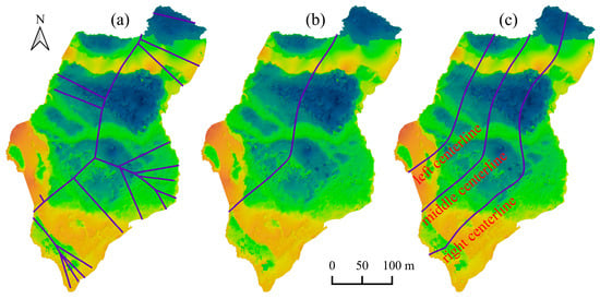 Based on the complete DEM of the study site, the Thiessen polygons (Figure 8a) were generated using the discrete points randomly sampled along the two banks. As indicated in Figure 8b, the centerline of the valley channel in Wolong Lake was achieved after removing redundant branches and smoothing the polyline. Then, the centerlines of the left and right sections of Wolong Lake were obtained reusing the Voronoi-based median axis extraction algorithm (Figure 8c). Finally, the three longitudinal elevation profiles were derived along the three centerlines, and their section lines were displayed in Figure 9.
