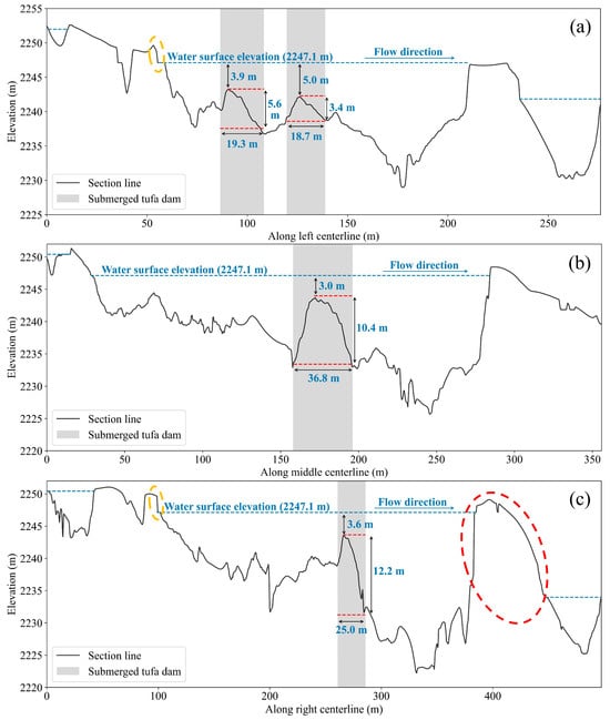 Longitudinal elevation profiles of the tufa dam system belonging to Wolong Lake. (a) Elevation profile along the left centerline; (b) elevation profile along the middle centerline; (c) elevation profile along the right centerline.